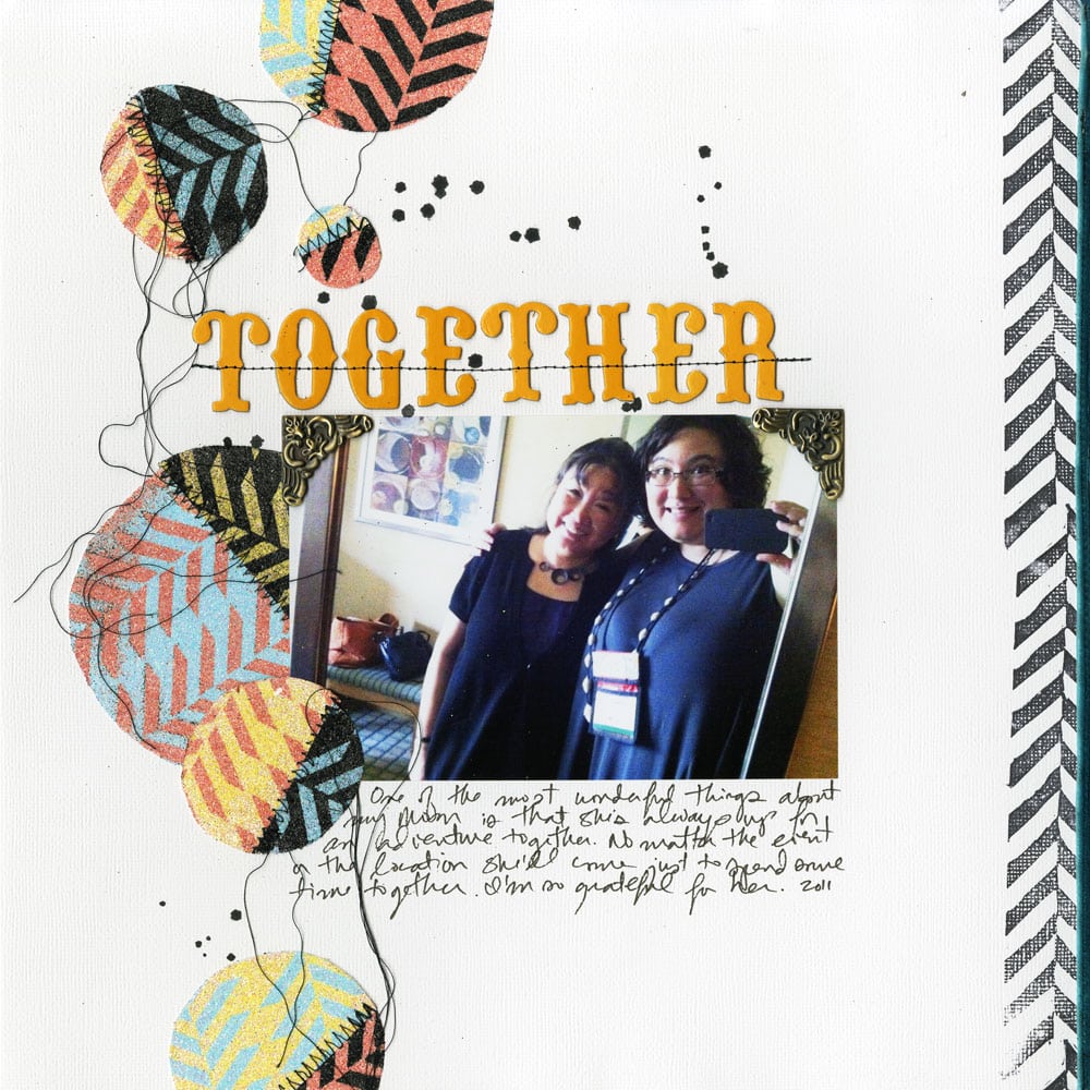 I took the glitter circles that I made and I used them here on a mixed-media scrapbook page about me and my Mom: