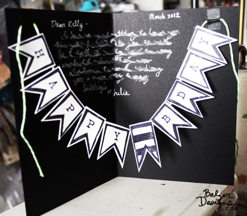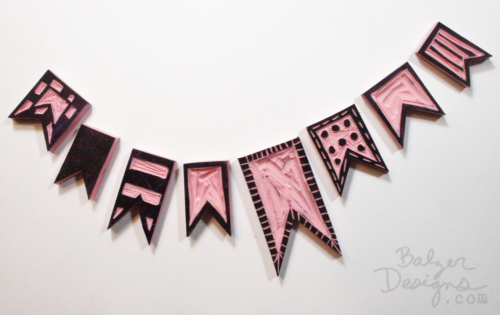 The banner is hanging just from the ends, so it has some nice movement when you open the card! Each of the banners and letters was stamped, using this set I carved: