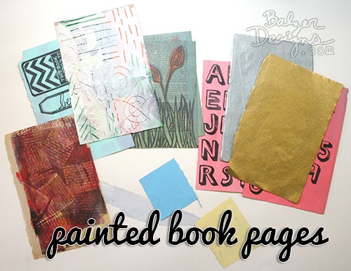 I also keep a wide variety of painted (and stamped) book pages around. Book paper collages easily and is another inexpensive surface to experiment on.