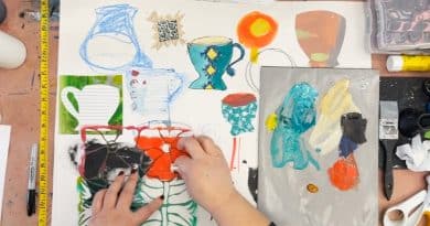 My best art tip is to always have some art supplies around where you sit, especially if you’re prone to veg in front of the tv or like to binge watch tv series. I got this tip from another artist – she suggested having a small art box where you sit by the tv so you can pick up the box and journal whenever you’re binge watching and make art at the same time. It has really helped me make art more often because I want to hang with the family and I can do that and play with my journal at the same time.