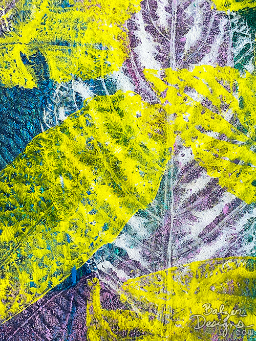 Here are two nature prints I did as demos during my live online, “Gelatin Printing from Your Backyard,” class. Both were made using my gelatin plate, layering organic shapes and playing with positive and negative space. One of the things I love about gelatin printing is that it holds onto texture so beautifully. Every little ridge and edge becomes part of the story. I’ve included my finger in a few places so that you can see the scale of the detail. Printing with leaves is amazing!